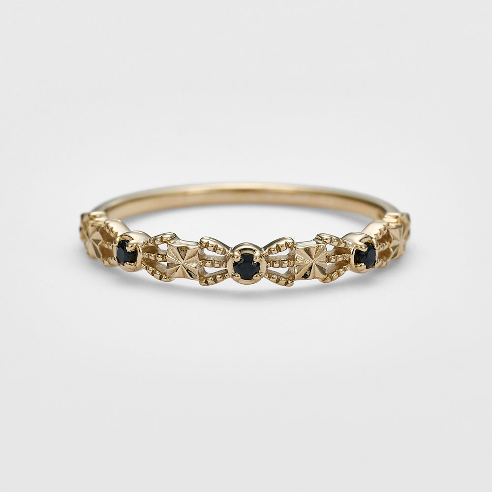 By arranging deep black spinels, it has a slender yet solid presence.